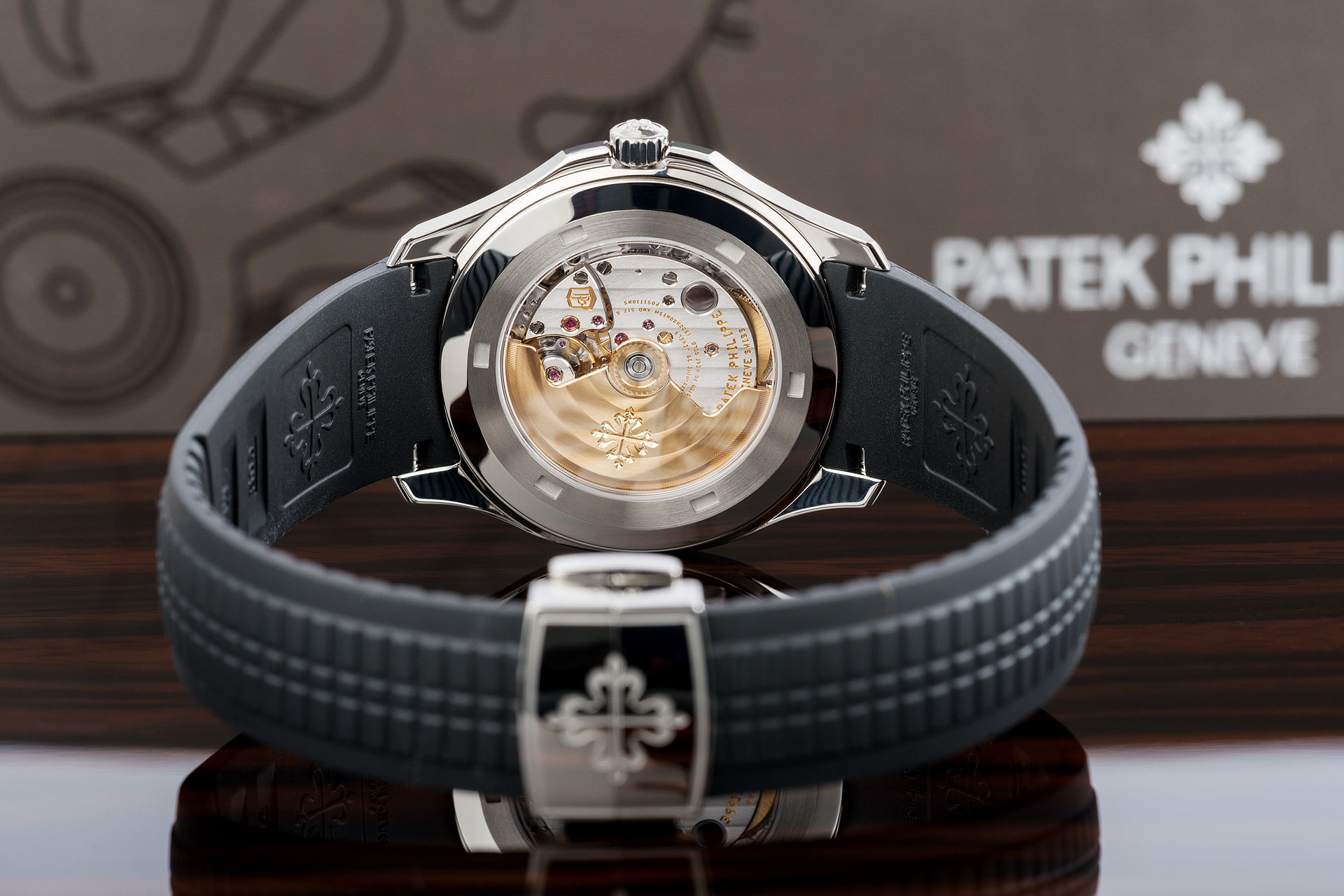 The Patek Philippe caliber 324 SC automatic movement contains 29 gemstones, is composed of 213 parts, has a vibration frequency of 28,800 vph, and has a power reserve of about 45 hours. Scratch-resistant sapphire crystal. Skeleton case back. Cushion box shape. Case size: 40mm. Fold-over clasp with safety release.