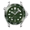 This 42 mm model is crafted from stainless steel and includes a green ceramic bezel with a white enamel diving scale. The dial is also polished green ceramic and features laser-engraved waves and a date window at 6 o’clock.