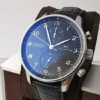 Silver-tone stainless steel case with black alligator leather strap. Fixed silver-tone stainless steel bezel. Black dial with silver-tone leaf-shaped hands and Arabic numerals. Minute markers around outer rim.
