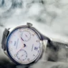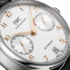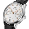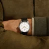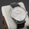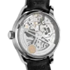 Silver-tone stainless steel case with black alligator leather strap. Fixed silver-tone stainless steel bezel. Silver-tone dial with rose gold leaf-shaped hands and Arabic numerals. Minute markers around outer rim.