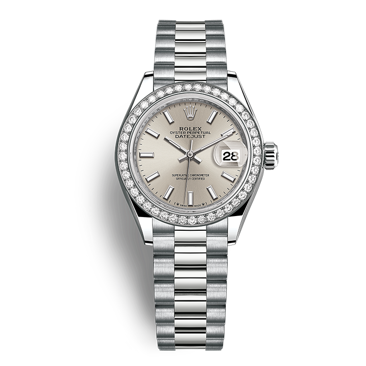The light reflections on the case sides and lugs highlight the elegant profile of the?28 mm Oyster case, which is fitted with a?diamond-set bezel. Rolex’s classic feminine watch, the Lady-Datejust is in the lineage of the Datejust, the emblematic model that has been a byword for style and accurate timekeeping.