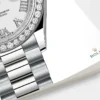 THIS OYSTER PERPETUAL LADY-DATEJUST IN 18 CT WHITE GOLD FEATURES A WHITE DIAL AND A PRESIDENT BRACELET.