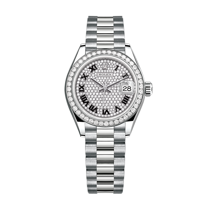 The light reflections on the case sides and lugs highlight the elegant profile of the?28 mm Oyster case, which is fitted with a?diamond-set bezel. Rolex’s classic feminine watch, the Lady-Datejust is in the lineage of the Datejust, the emblematic model that has been a byword for style and accurate timekeeping.