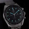 Presented on a brushed five-arched-links-per-row bracelet, this 42 mm Moonwatch in stainless steel features hesalite glass on the front and an embossed Seahorse medallion on the caseback. Inspired by the 4th generation Speedmaster style worn on the moon, it also includes an asymmetrical case, black step dial and the famous dot over 90 on the anodised aluminium bezel ring.