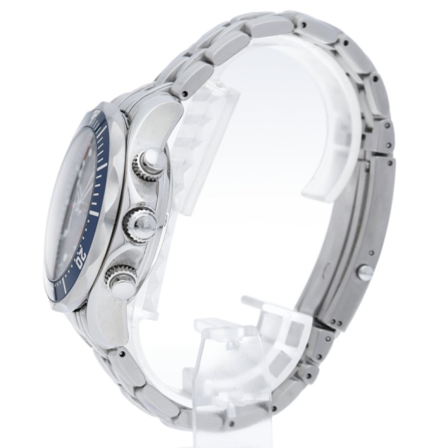 This OMEGA Seamaster Diver 300M features a blue dial decorated with a wave pattern. There is a date window at the 3 o’clock position, 30-minute and 12-hour recorders and a small seconds dial. The distinctive dial is visible through a scratch-resistant sapphire crystal. The blue unidirectional rotating bezel is mounted on a 41.5 mm stainless steel case with a helium-escape valve at 10 o’clock.