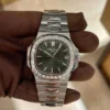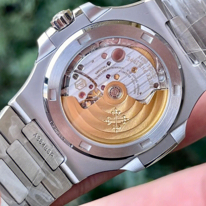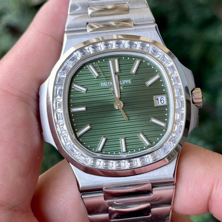 This Patek Philippe Nautilus features a distinctive shape of the octagonal bezel with its softened angles accentuated by a row of 32 internally flawless Top Wesselton baguette-cut diamonds (~3.6 cts).