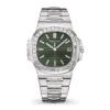 This Patek Philippe Nautilus features a distinctive shape of the octagonal bezel with its softened angles accentuated by a row of 32 internally flawless Top Wesselton baguette-cut diamonds (~3.6 cts).