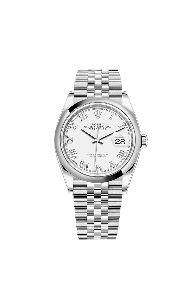 THIS OYSTER PERPETUAL DATEJUST 36 IN OYSTERSTEEL FEATURES A WHITE DIAL AND A JUBILEE BRACELET.