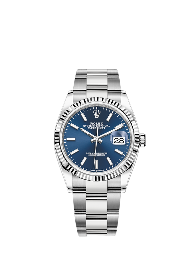 THIS OYSTER PERPETUAL DATEJUST 36 IN OYSTERSTEEL AND WHITE GOLD FEATURES A BRIGHT BLUE DIAL AND AN OYSTER BRACELET.