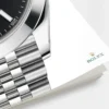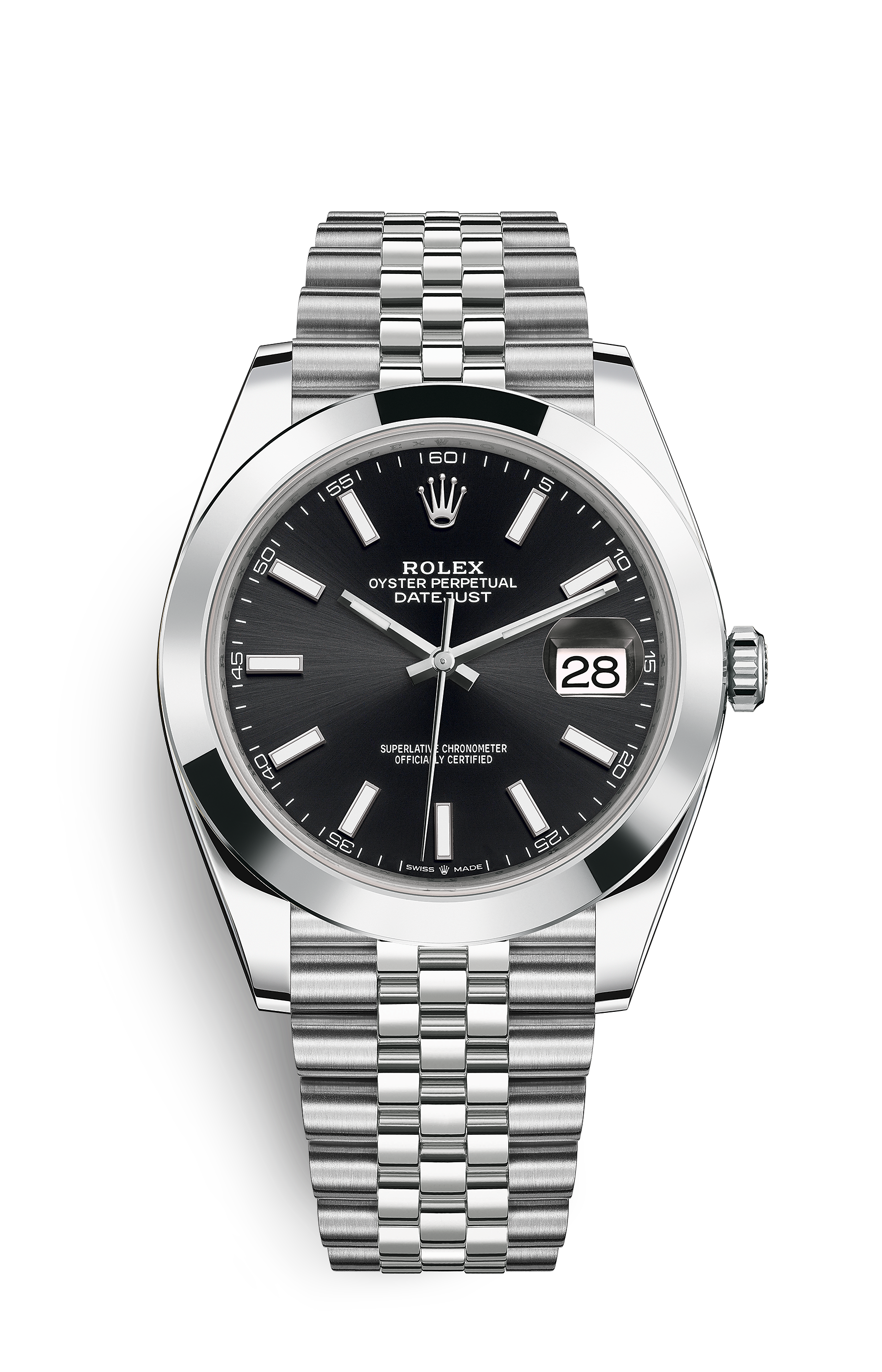 THIS OYSTER PERPETUAL DATEJUST 41 IN OYSTERSTEEL FEATURES A BRIGHT BLACK DIAL AND A JUBILEE BRACELET.