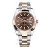 THIS OYSTER PERPETUAL DATEJUST 41 IN OYSTERSTEEL AND EVEROSE GOLD FEATURES A CHOCOLATE DIAL AND AN OYSTER BRACELET.
